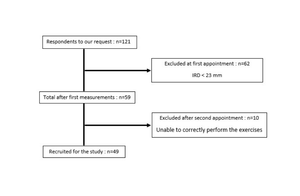 The participants were postpartum women recruited from the patients attending the CUMPR from June 2020 to August 2021. To be included participants had to be aged between 18 and 40, have given birth more than 6 weeks and less than 6 months earlier, have an IRD of at least 23 mm measured at 5 cm above the umbilicus [5]. Women being pregnant, having given birth within the previous 6 weeks or more than 6 months earlier, having undergone abdominal surgery within the previous 6 months excepted caesarean, and women who were unable to perform all the exercises correctly were excluded from the study.