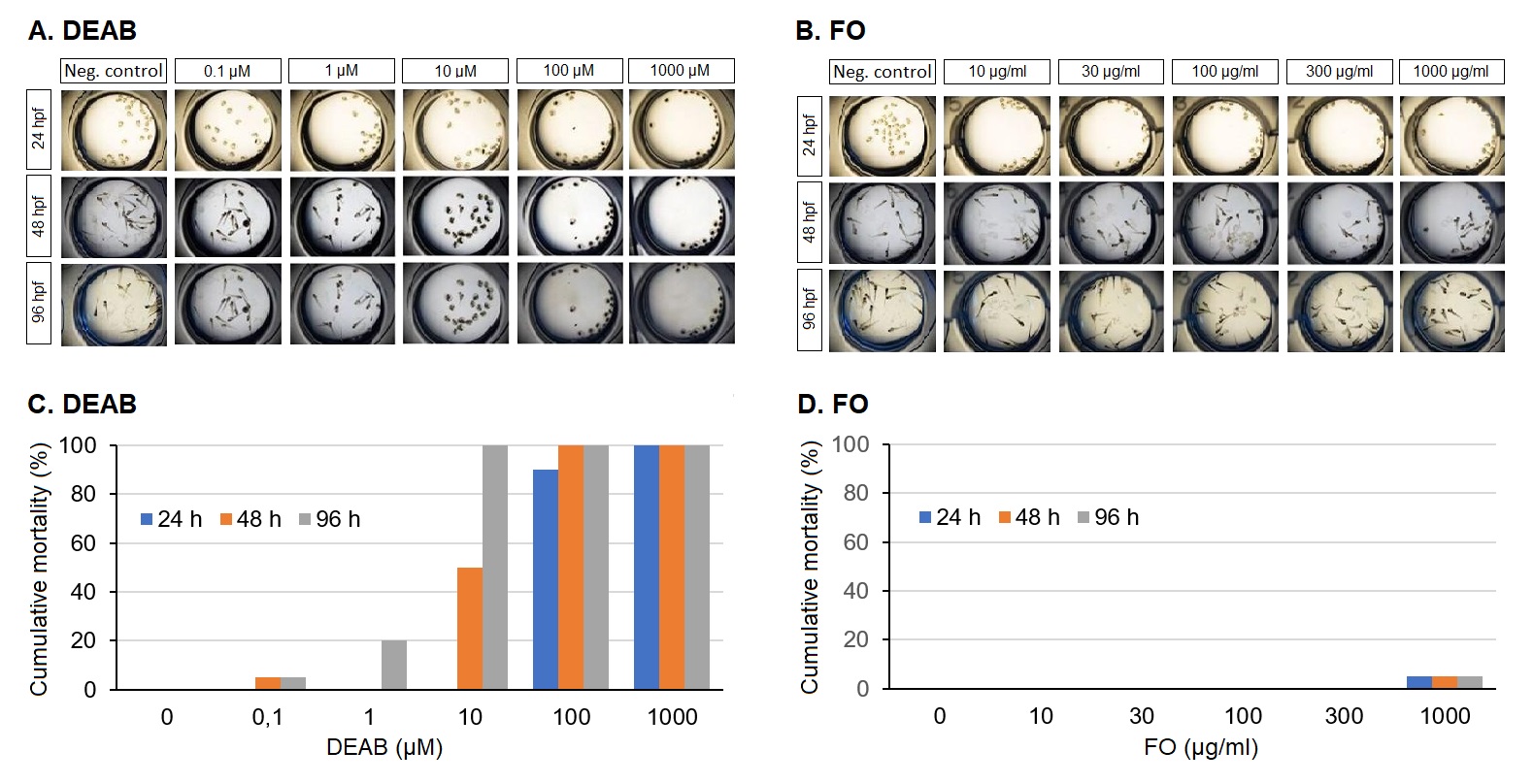 The E3 medium served as a vehicle control which did not provoke mortality or morphological changes in the embryos. Based on the above results, we have chosen 300 µg/ml FO as the highest concentration without causing cumulative mortality.