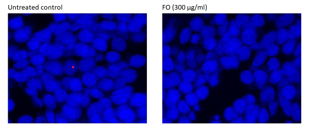 Genotoxicity assay was performed according to the OECD test guideline 236. At 3 hpf, zebrafish embryos were incubated with E3 medium or Frankincense oil (300 μg/ml) for 96 h and mortality was checked every 24 h for 3 days. Following the test drug exposure, zebrafish embryos were anaesthetized with 0.17 mg/ml tricaine methane-sulfonate (MS-222) [27] and fixated with 4% paraformaldehyde (PFA) overnight at 4°C. After fixation, the embryos were washed twice in 1× PBST and incubated overnight in 30% sucrose/ 0.02% sodium azide/ 1× PBS solution. Embryos were embedded in optimal cutting temperature (OCT) blocks and cut into thin sections of size 14 µm. Before staining with 4′,6-diamidino-2-phenylindole (DAPI), the sections were rehydrated. Microscopic analysis was performed using SP5 confocal microscope. Each 100 nuclei were analyzed and micronuclei were counted.
