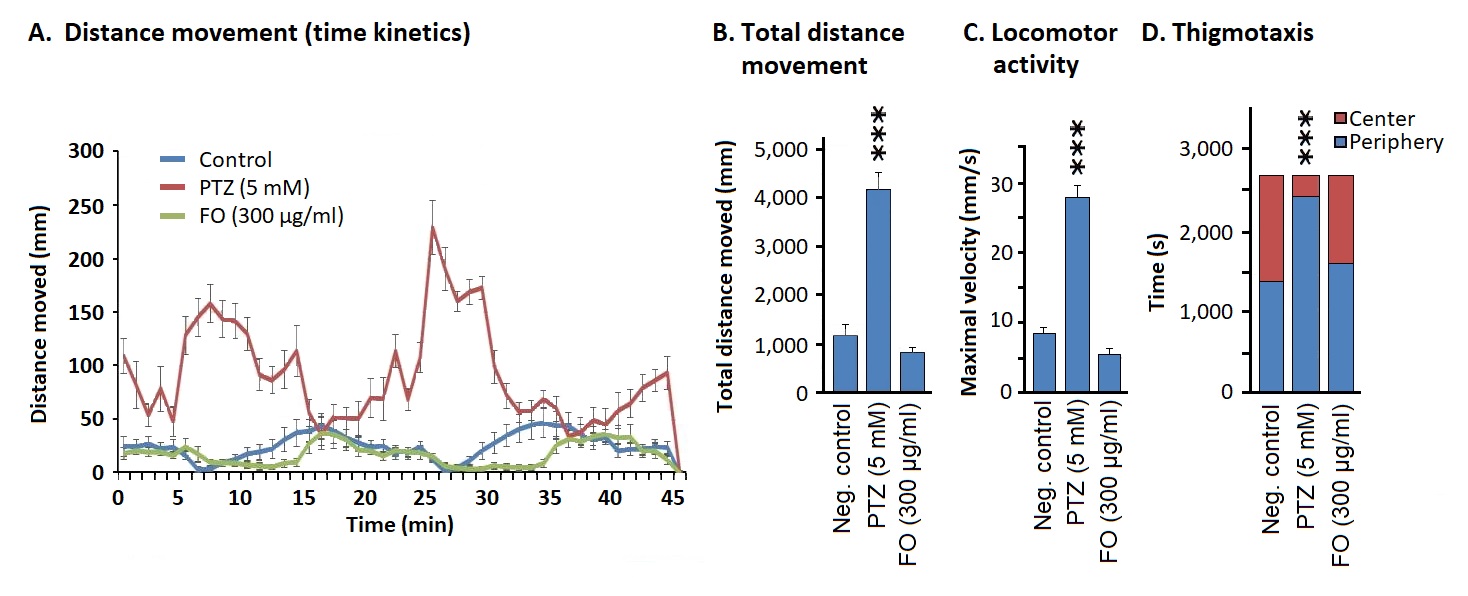 Thigmotaxis assay: We measured the directed movement generated by thigmic stimuli (touch stimuli). PTZ-treated embryos spent significantly more time in the peripheral region of the water tank if compared to the negative control group (p<0.001), whereas the negative control group and FO-treated group spent equal time in both the center and periphery (Figure 3D).