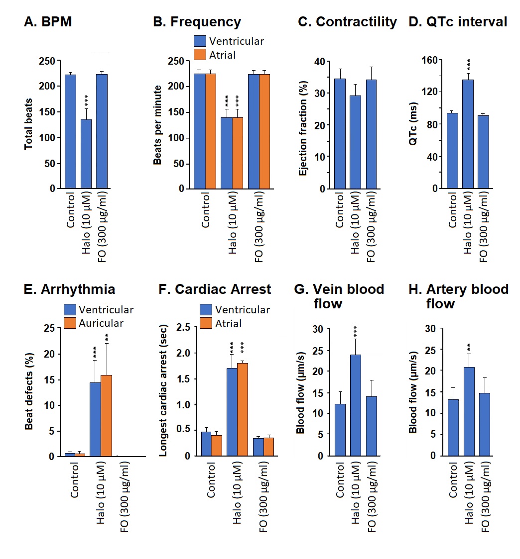 Treatment with haloperidol (positive control) significantly reduced both the atrial and ventricular BPM if compared to the negative control (p<0.01). In contrast, FO treatment did not significantly change the atrial and ventricular BPM (Figure 4B).