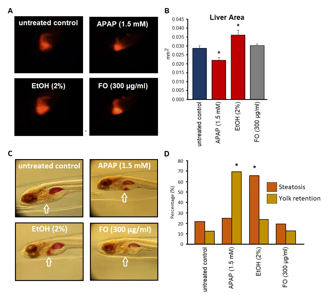 Acetaminophen-treated zebrafish (positive control) showed a significantly decreased liver size if compared to the negative control (p<0.05). In contrast, the ethanol (2%) treated group displayed a significantly increased liver size if compared to the vehicle-treated group (p<0.05). However, FO did not significantly change the liver size if compared to the vehicle-treated group (Figures 5A and 5B).