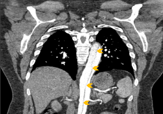Figure 2: Coronal chest CT angiography demonstrating acute aortic dissection (arrows) extending from aortic root (off plane) to iliac arteries (off screen).