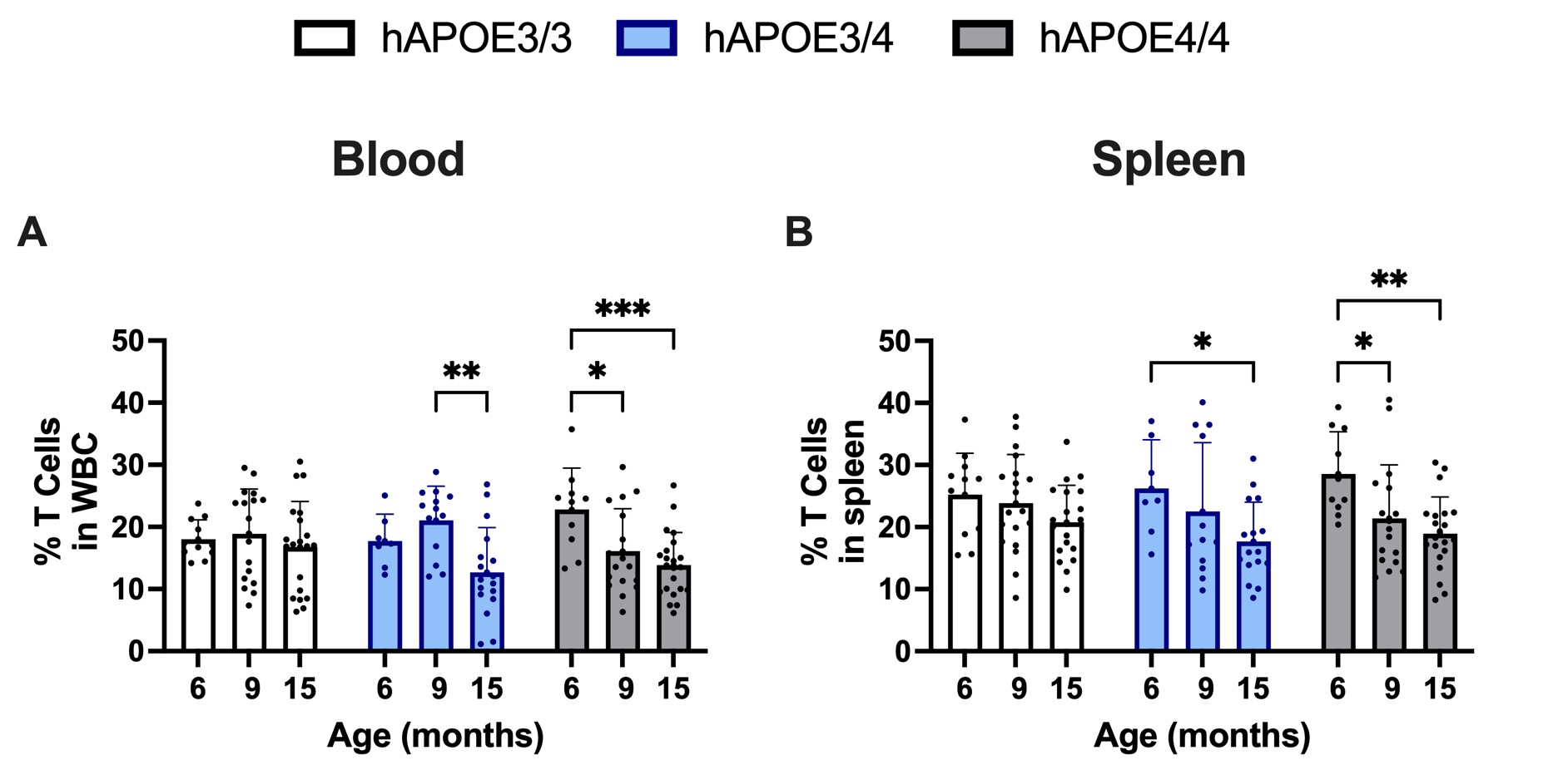 Female humanized APOE mice (APOE3/3, APOE3/4, and APOE4/4) maintained under sterile housing were assessed at 6, 9, and 15 months. Peripheral immune profiling of WBC and spleen was performed by multicolor flow cytometry focused on T cell and B cell populations, and plasma cytokines were quantified by immunoassays.