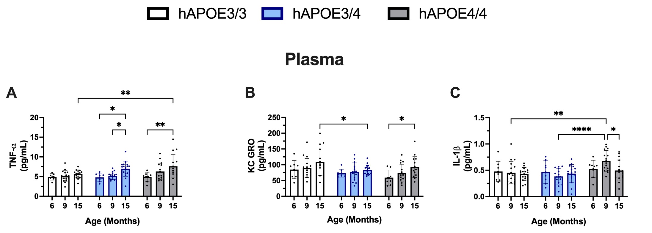 Figure 5. Plasma cytokine levels in sterile-house female hAPOE mice. TNF-α levels increase in APOE4 carriers at 15-months of age (A). KCGRO levels increase at 15-months in the APOE4/4 condition but not observed in other genotypes (B). IL-1β levels increase in the APOE4/4 genotype at 9-months of age (C). p≤0.05, **p≤0.01, ***p≤0.001, ****p≤0.0001.