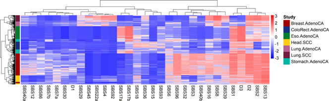BaP Multi-NMF can also answer questions about how mutational profiles of different cancer types relate to each other. We find three main clusters: one that contains breast and head cancers, one containing stomach, colorectal, and esophagus cancers, and one containing lung adenocarcinoma and lung squamous cell carcinoma. Each cluster can be divided into subgroups defined by cancer type, with some notable exceptions. First, we found a small group of breast cancers that were more similar to head cancers than the majority of breast cancers. This result appears to be driven by lower exposure to mutational signatures SBS40a, SBS12, and SBS3 and, more generally, signatures in the cluster ranging from SBS6 to SBS39. Another interesting finding is a subgroup of stomach cancers that clustered with esophageal cancers, as a result of higher exposures to SBS17a compared to other stomach cancers.