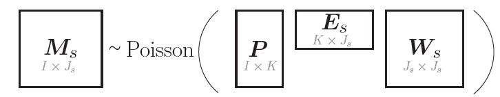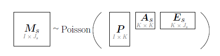2.3.1 Bayesian NMF: We now extend the setting of Section 2.1 to the case of S studies, each comprising Js observations (e.g. tumors) and providing the count matrix Ms of dimension I × Js, for s = 1, · · ·, S. In Multi-Study Non-Negative Matrix Factorization [17], a key feature is that the set of active mutational processes is specific to the study, but if process k is shared by multiple studies, the corresponding signature pk remains the same. To achieve this, the mutational counts of study s are decomposed as: