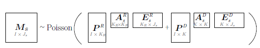 2.3.2 Recovery and discovery using Bayesian NMF: A key innovative use of this model is the introduction of semi-supervised recovery-discovery matrix factorization, which allows for simultaneous identification of known signatures and discovery of novel ones. The resulting method incorporates signatures from, for example, the Cosmic [37] database, while allowing for uncertainty in the precise values of the entries of Pk . To achieve this, NMF decomposition is split into two additive components: one for recovery of known signatures and another for discovery of novel study-specific signatures, such as those arising from previously unexplored tissues, exposures, treatments, or sequencing protocols. Formally, we arrange the Ms ∼ Poisson (PAsEs) structure as follows: