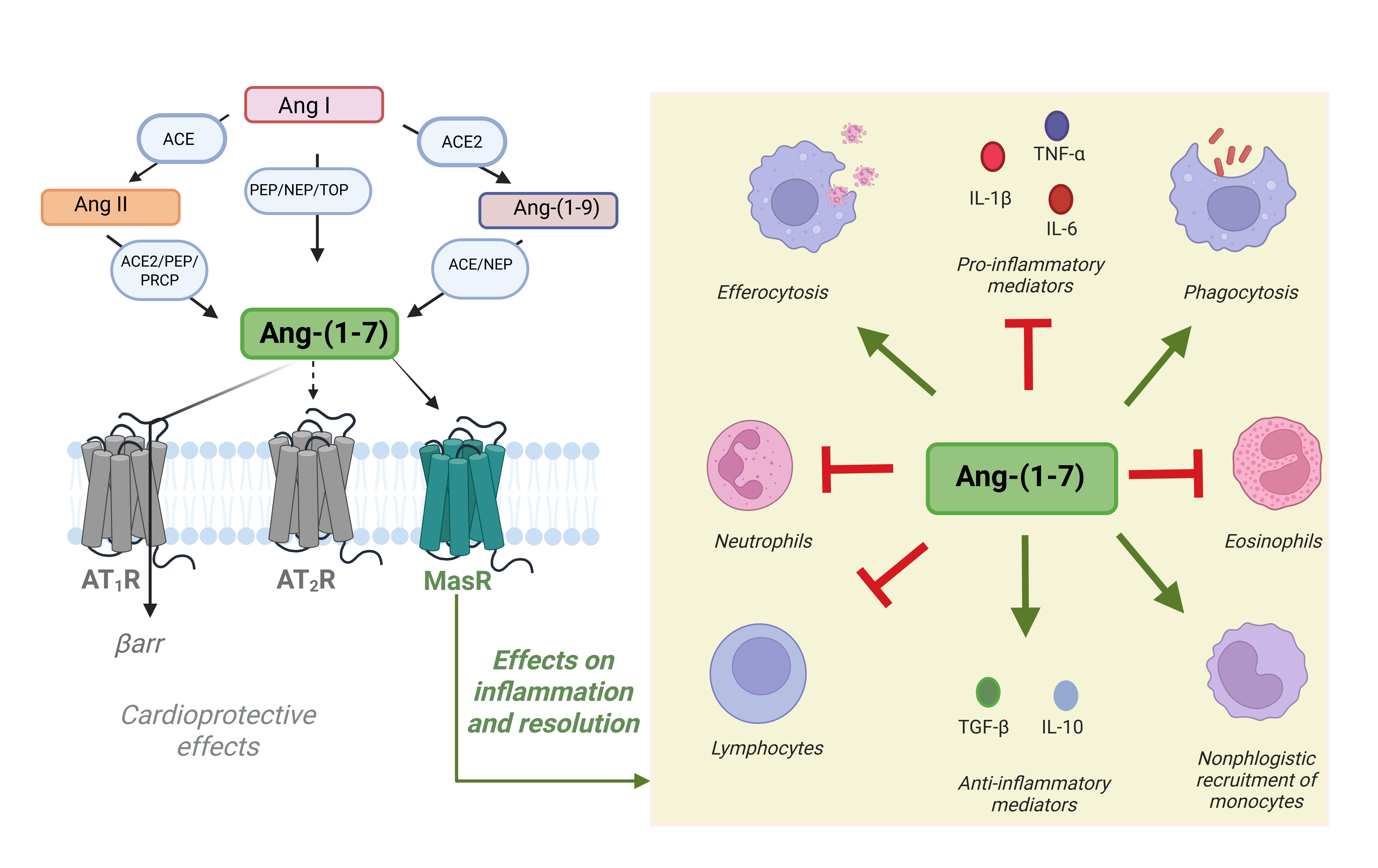 The autocrine and paracrine effects of Ang-(1-7) are mainly mediated by the G protein–coupled receptor Mas (MasR) [9], which is expressed in various tissues, including the heart, brain, kidney, and lungs [10], as well as in immune cells such as macrophages [11–13]. By interacting with MasR, Ang-(1-7) has been shown to decrease infiltration of neutrophils, eosinophils, and lymphocytes, thereby reducing tissue damage caused by excessive inflammation in preclinical models of arthritis [14], asthma [15,16], pulmonary fibrosis, chronic obstructive pulmonary disease (COPD), and acute lung injury [17,18], ischemic stroke [19], ultimately preventing several features of inflammation [11,20]. Interestingly, a single dose of Ang-(1-7) promotes lung inflammation resolution and provides lasting protection against secondary challenges with allergens or endotoxin by enhancing IL-10, regulatory T cells, and macrophage efferocytosis [18].