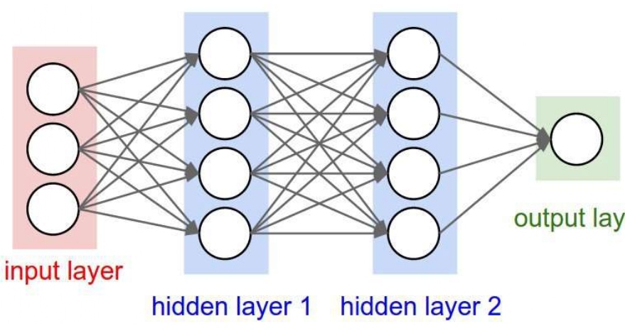 Figure 3: An example of a Deep Neural Network with three different input artificial neurons, two hidden processing layers with each four artificial neurons and one output layer.