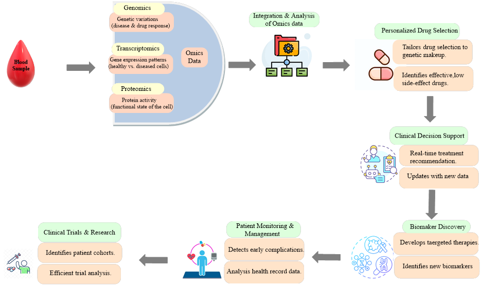 AI-driven personalized medicine in hematology aims to tailor treatment strategies to individual patient characteristics, thereby optimizing efficacy and minimizing adverse events. The integration of AI with technologies like CRISPR-Cas9 gene editing may enable the development of personalized therapies tailored to individual patients and specific pathogen strains. Machine learning algorithms analyze vast datasets, integrating patient demographics, clinical parameters, genetic profiles, and treatment responses to identify patterns and predict individual responses to therapy. This enables clinicians to select the most appropriate treatment modality for each patient, considering factors such as disease sub-type, molecular profile, comorbidities, and prior treatment history [41]. For instance, in acute myeloid leukemia (AML), AI algorithms have been developed to predict patient responses to chemotherapy and allogeneic stem cell transplantation, facilitating risk stratification and individualized treatment decisions [42]. Figure 2 provides a schematic representation of how AI integrates multi-omics data (genomic, transcriptomic, proteomic) with clinical information to predict treatment response and guide personalized treatment decisions for hematological disorders.