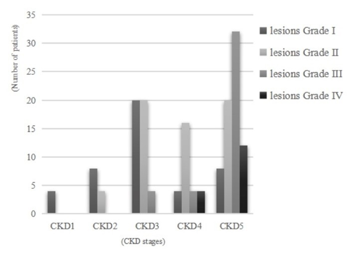 A total of 118 CKD patients with fundus lesions treated at Zigong First People’s Hospital (Feb 2023–Feb 2024) were enrolled per inclusion/exclusion criteria. All participants received both clinical care and ophthalmic evaluation. Inclusion: KDIGO-defined CKD, age ≥ 18, complete clinical/lab data, baseline and fundus exams, and informed consent. Exclusion criteria included: renal replacement therapy, ocular disease interfering with fundus imaging, major organ failure, diabetes, infections, RAS blockers, outside referrals, psychiatric illness.