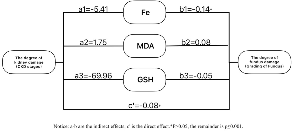 Results: Levels of Fe, MDA, and GSH showed significant differences across CKD stages (P<0.001). Logistic regression identified sex, mean arterial pressure, total cholesterol, hemoglobin, ferritin, Fe, MDA, and GSH as significant factors in CKD-related fundus lesions (P<0.05). MDA (β=0.15, 95%CI: 0.03–0.26) and GSH (β=0.33, 95%CI: 0.16–0.54) significantly mediated the link between renal decline and retinal damage (P ≤ 0.001).