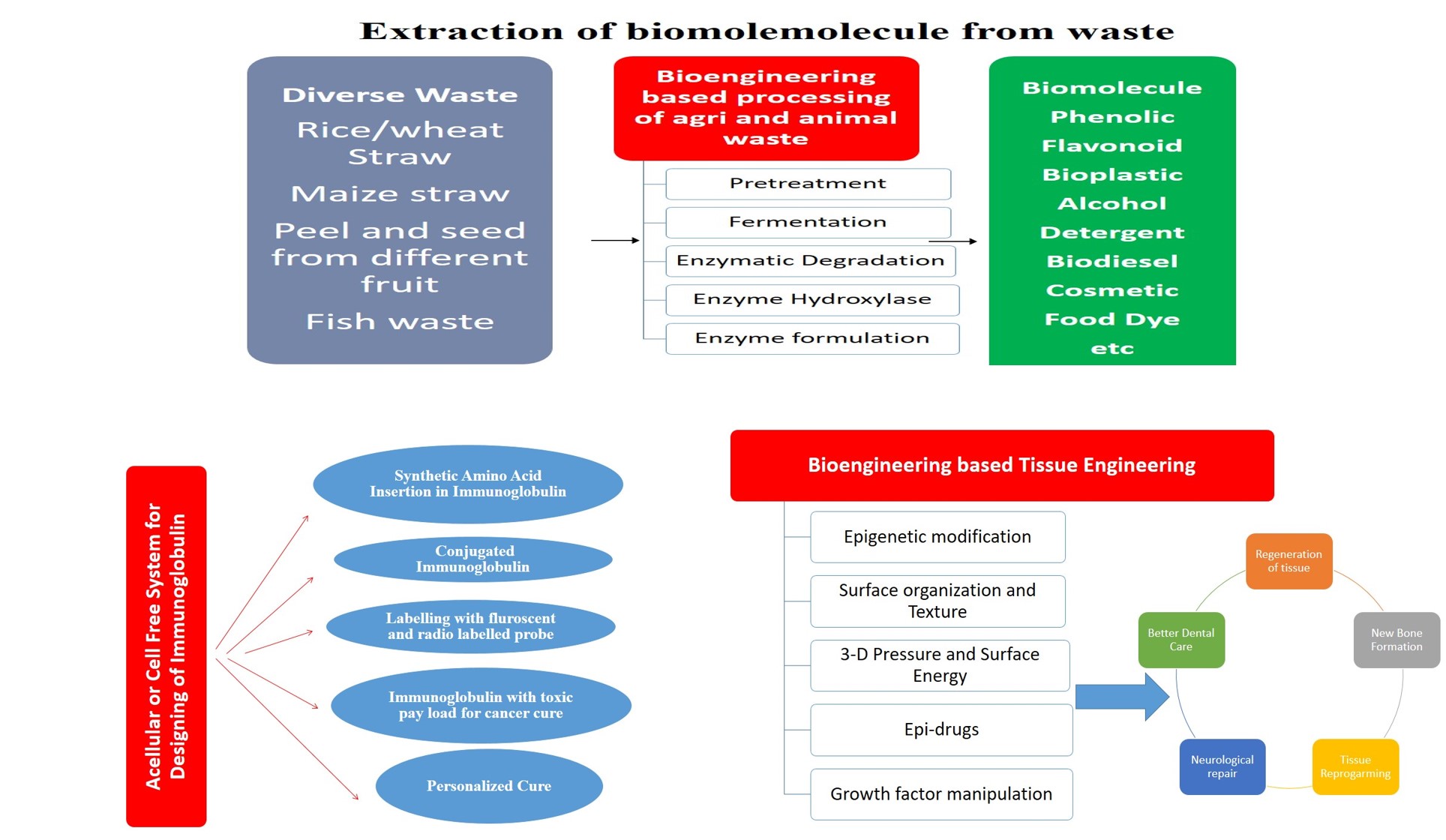With the emergence of latest approaches like next generation sequencing technology, metabolomics, metagenomic and multiomic technology, the gigantic information pertaining to microbes and their functioning is generated every day. It is plausible to argue that future endeavor of bioengineering will further reduce the cost of biomolecules and bioprocesses as well as better management of wastes including E-waste. Better and cost-effective setups will be developed for designing synthetic. There are diverse sources of waste from agricultural and animal origin, these fields demand more serious and elaborative studies for development of processes for waste processing from these sources. There should also be more emphasis to lower down the cost of process pertaining to extraction and purification of biomolecules from waste, every extracted component must be evaluated for its possible application in different fields to its maximum potential.