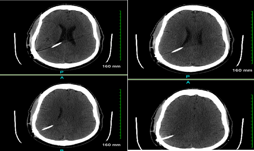 Figure 1. CT head with and without contrast. A right posterior parietal approach shunt extending though the lateral ventricle with its tip at the posterior midline in the upper third ventricle. Ventricular system appears to be decompressed. The intracranial and extracranial shunt tube appears to be normal.
