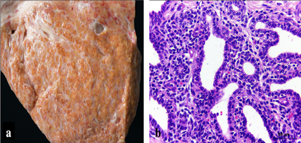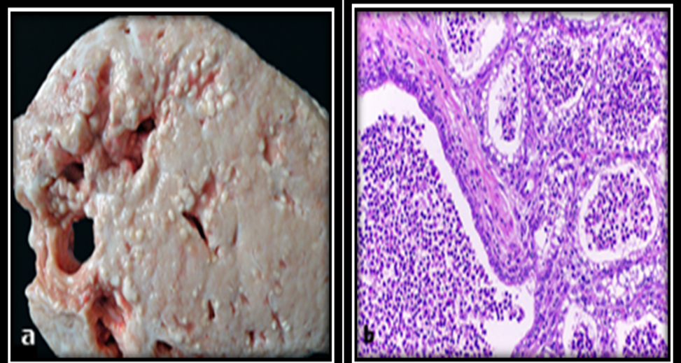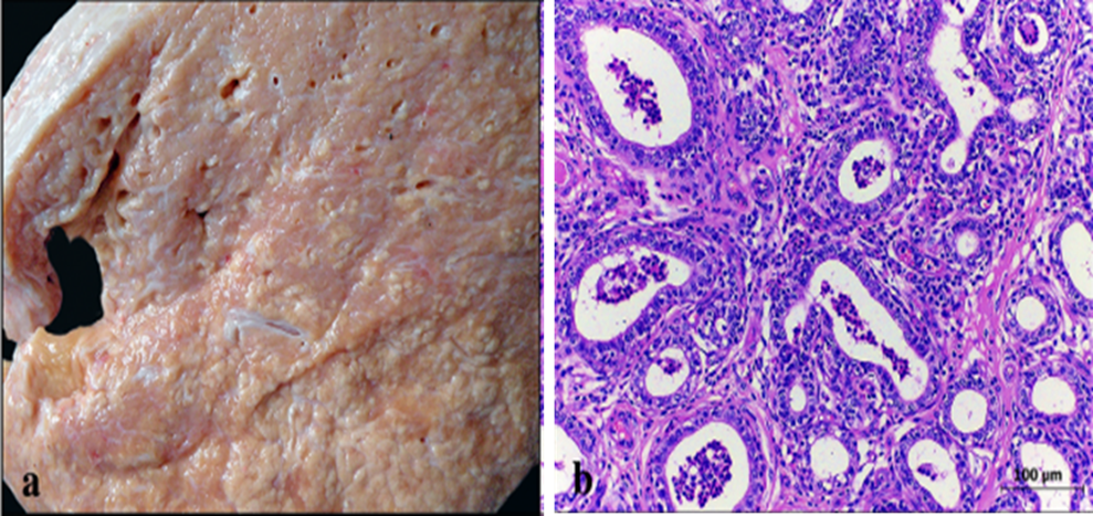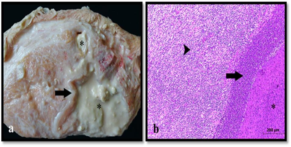 Figure 7. Gross (a) and histopathological (b) lesion of granulomatous mastitis, H&E [45].
