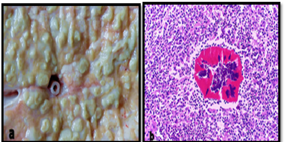 Figure 3. Gross (a) and histopathological (b) lesion of pyogranulomatous mastitis (H &E) [42].