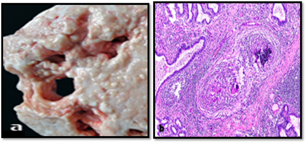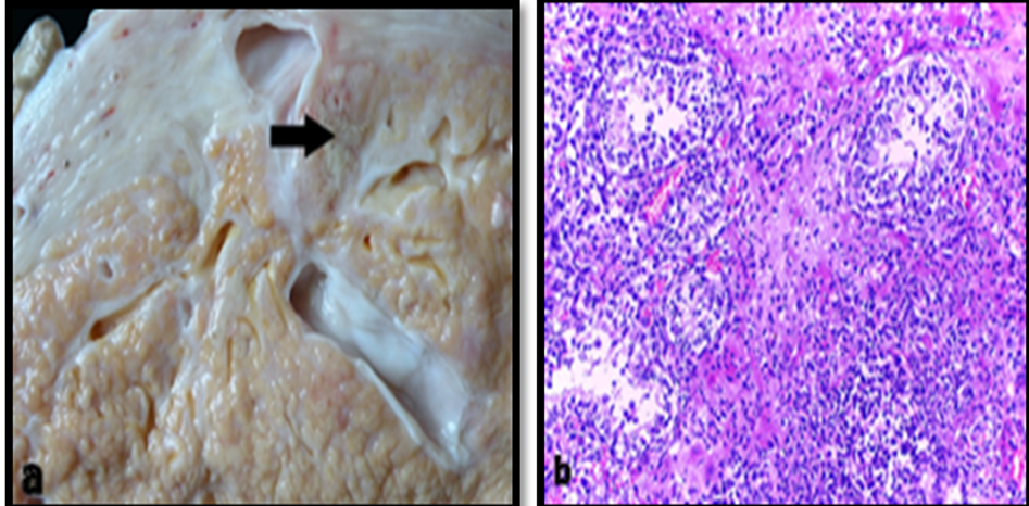 Figure 2. Gross (a) and histopathological (b) lesion of lymphoplasmacytic (H&E) [38].