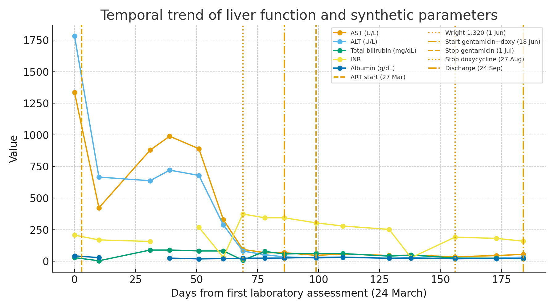 Figure 2. Temporal trend of liver function and synthetic parameters.