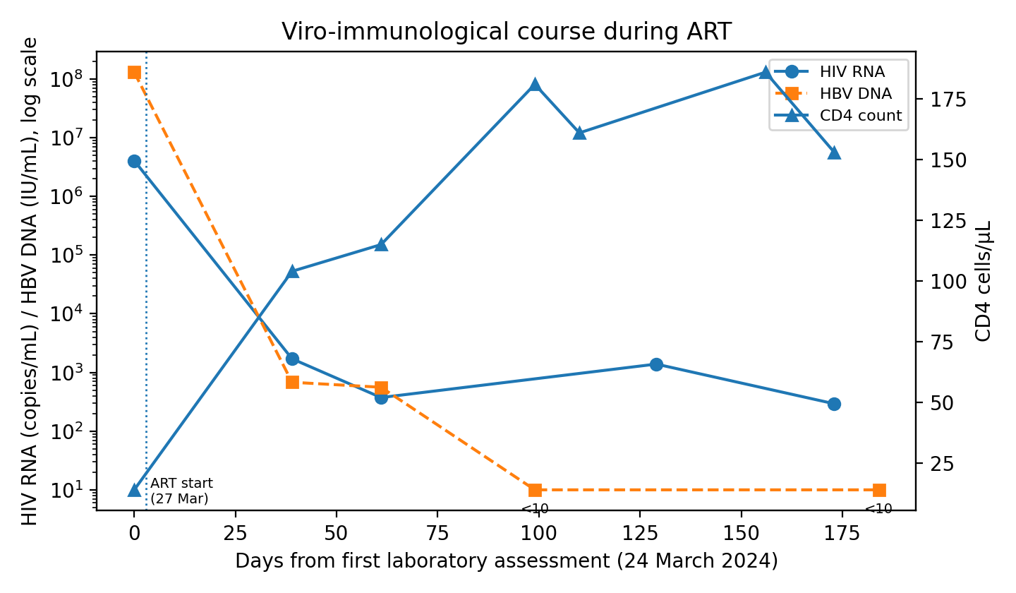 A few days after admission, ART was started with a fixed-dose combination of bictegravir/emtricitabine/tenofovir alafenamide in order to treat both HIV and HBV. In the first weeks of therapy, HIV-RNA and HBV DNA declined by several logs, while CD4 count rose above 100 cells/µL and liver enzymes decreased, suggesting partial biochemical improvement.