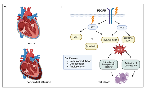 Figure 1: (A) Accumulation of fluid in the pericardial sac compromises ventricular expansion. This reduces pre-load and reduces stroke volumes. As cardiac output declines, blood pressure drops and, if cardiac output is insufficient to meet metabolic demands, cardiac shock develops. Meanwhile, the compression of the right atrium and ventricles causes backpressure in the systemic veins leading to elevated central venous pressure, which manifests as jugular venous distension. (B) Src are key regulators of multiple signalling pathways, including those involved in cell proliferation, migration, and adhesion. Inhibition of Src kinases can impair endothelial cell function, potentially increasing vascular permeability. Increased permeability of blood vessels can allow fluid to leak into surrounding tissues, including the pericardial sac, leading to effusion. PDGFR is a receptor tyrosine kinase that is primarily involved in regulating cell growth, survival, and migration, particularly in vascular smooth muscle cells and fibroblasts. It is often activated in cancer and fibrotic diseases, where it promotes tissue remodelling and angiogenesis. PDGFR inhibition can impair fibroblast-mediated tissue repair and remodelling, making the pericardium more susceptible to chronic effusion or pericarditis.