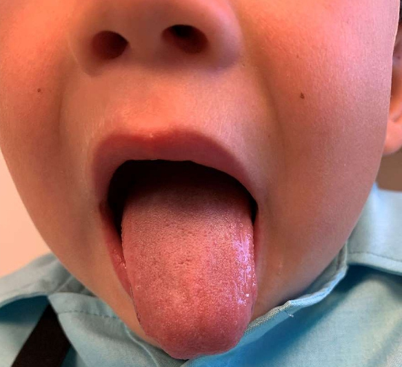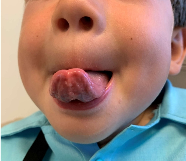 The majority of these lacerations are horizontal in orientation [1]. In general, small lacerations of the tongue can be allowed to self-heal when wound margins are in good approximation [5]. Because suturing may predispose the tongue to invasive, closed-space infection and requires general anesthesia for children, surgical closure is recommended only in cases of larger wounds, profuse bleeding, muscle involvement, or full thickness injury [3-5]. This case describes the presentation and repair of a rare full-thickness longitudinal tongue laceration in a 3-year-old male.