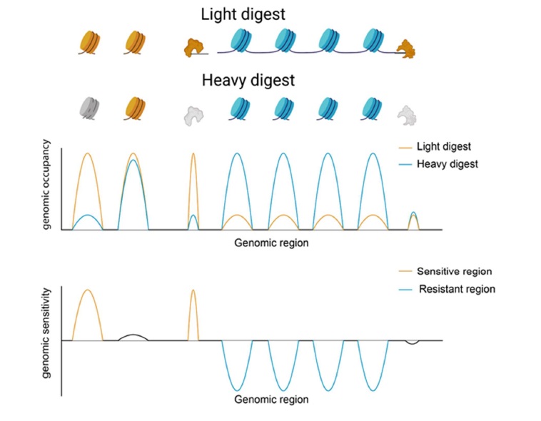 Figure 1: Nucleosome sensitivity to MNase digestion. Sensitive nucleosomes and bound factors, indicated by the color yellow, are preferentially released under light MNase digestion conditions. Resistant nucleosomes, shown in blue, are resistant to light digest conditions and are cut under heavy MNase digestion. Heavy MNase digestion over digests sensitive nucleosomes and bound factors, shown in grey. The middle panel depicts the average normalized number of mapped reads to genomic regions from both heavy and light MNase digestion. In the bottom panel, MNase sensitivity is determined by calculating the log ratio of mapped reads from light and heavy digest conditions.
