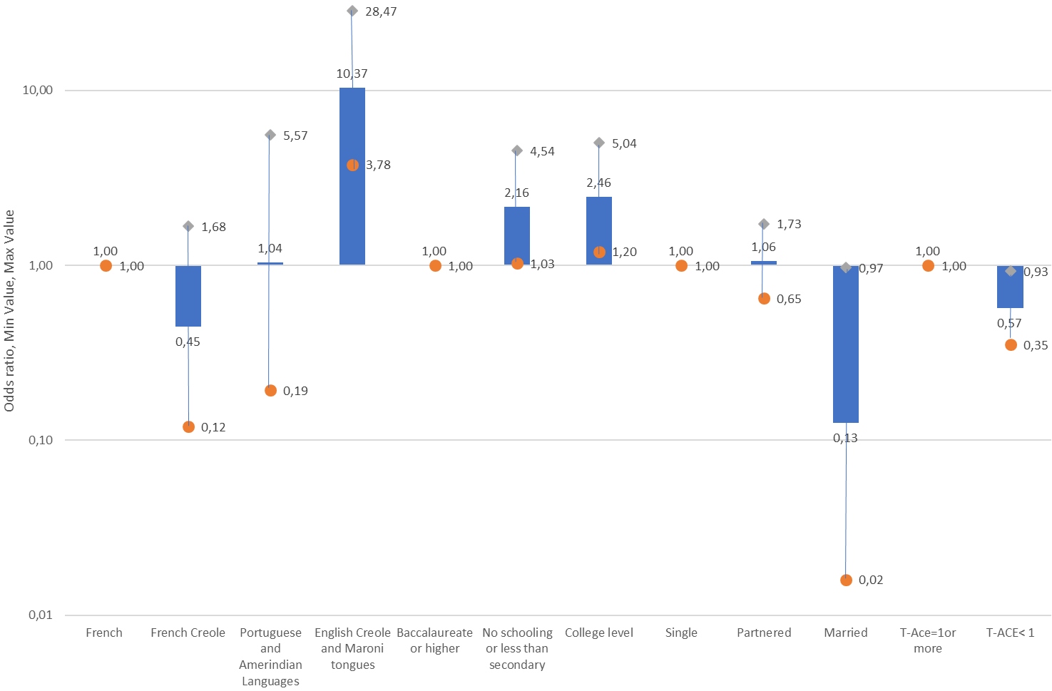 Figure 1: Odds-ratio (Min-Max) for explaining Pemba use, controlled by six variables.
