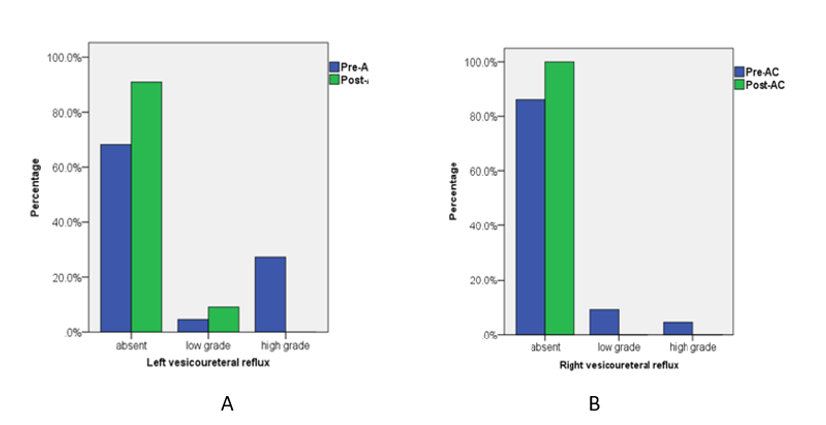 VUR was found in 31.8% (7/22) of patients (10 kidney units) pre-AC. None of them underwent ureteral reimplantation. In post-AC, left and right high-grade VUR (III-V) were resolved in 90.9% of cases (p=0.01) and 100% (p=0.001) of the patients, respectively (Table 1 and Figures 1A and 1B).