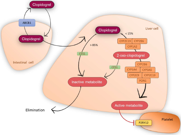 The rate of clopidogrel gastrointestinal absorption can vary between individuals, thus affecting the response onset [9,10]. The levels of expression of P-glycoprotein (P-gp), encoded by ABCB1, an ATP-dependent transporter, could affect its permeability and thus alter the oral bioavailability of clopidogrel [9,11].