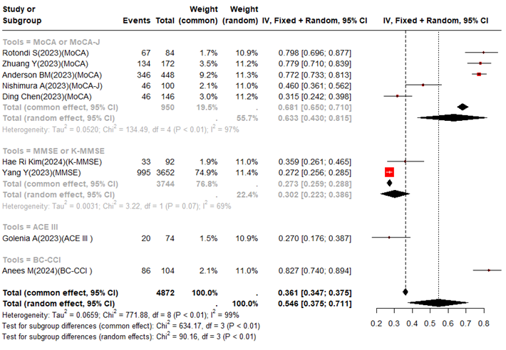 We notice that from 2023 to 2024, some researchers explored the prevalence of cognitive impairment in maintaining hemodialysis. We can see that there are differences in the assessment methods, disease duration, and the number of hemodialysis patients among different studies. Published from 7 countries, with 6 studies [8-13] from Asia and 3 studies [14-16] from Europe. In terms of assessment methods, they mainly involve Montreal Cognitive Assessment (MoCA )[8,10,14,15], Montreal Cognitive Assessment Japanese (MoCA-J) [12], Mini Mental State Examination (MMSE) [9], Korean Mini Mental State Examination (K-MMSE) [11], Brain Damage and Cognitive Change Index (BC-CCI) [13], and Addenbrooke's Cognitive Examination III (ACE III) [16]. In the newly-published studies included, the reasons for the significant differences in the incidence of cognitive impairment among hemodialysis patients, in addition to differences in assessment methods, are as follows: 1) Most of the studies are single center studies, and the included cases are less than 200, resulting in sample size bias; 2) Even though these studies involve a significant range, only three of them [10,13,16] analyze multiple risk factors of cognitive impairment. However, since there are significant differences among different risk factors, it remains a serious challenge to analyze independent risk factors based on existing newly-published studies (Table 1). This also suggests that there is still a lack of sufficient attention to the study of cognitive impairment in hemodialysis patients in existing studies. We extracted the number of patients with cognitive impairment and the number of hemodialysis patients from the newly-published studies for further meta-analysis. We used the heterogeneity index (I2) to assess heterogeneity among different studies. When I2>50%, we used a random effects model; when I2<50%, we used a fixed effects model. In our forest plot, we presented the results of both the fixed effects model and the random effects model. During analysis, we conducted subgroup analysis on the assessment methods. Due to the inclusion of less than 10 new articles, we failed to analyze the publication bias through funnel plots. The entire analysis process is described in R4.4.1 (https://cran.r-project.org/).