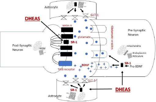 Figure 2: Proposed Impacts of DHEA on Glutamate Transmission. DHEA is suggested to alter glutamate transmission through its effects on the sigma-1 receptor (SR-1) in at least important three ways. In one pathway, DHEA acts on SR-1 which has translocated from the mitochondrial associated membrane (MAM) between the mitochondria and endoplasmic reticulum to the plasma membrane. At the plasma membrane, SR-1 alters the NMDR ionotropic receptor and modulates the impact of glutamate on the receptor itself. In another pathway, DHEA acts on SR-1 to change pro-BDNF to BDNF. BDNF promotes glutamate release pre-synaptically. Post-synaptically, BDNF acts at the TrKB receptor to alter the NMDA receptor. In addition, SR-1 acts on the glutamate transporter-1 (GLT-1) located in astrocytes to recycle glutamate thus reducing potential glutamate excitotoxicity
