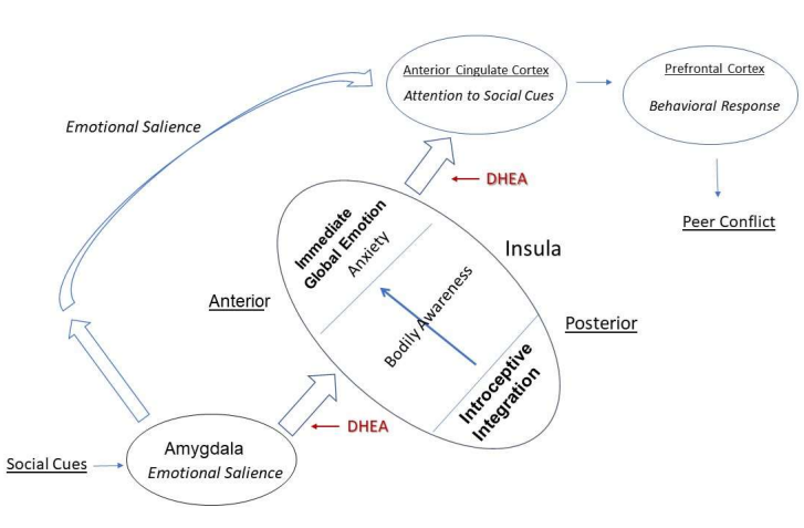 Figure 1: Schematic Representation of DHEA and Peer Conflict Among Girls. The anterior insula (AI) integrates bodily sensation from the posterior insula with emotional salience from the Amygdala to immediate global emotion, or bodily feeling in the moment. This information is conveyed to anterior cingulate cortex (ACC) where it is compared to direct information from the amygdala. If the signals are discrepant, a signal is sent to the prefrontal cortex to produce a behavioral response. With adrenarche, increasing levels of DHEA act to increase the connectivity of the insula with the amygdala and ACC. For girls this heightens the emotional salience of social cues from peers, leading to anxiety about their bodies.This anxiety promotes a behavioral response which leads to conflict with those peers.