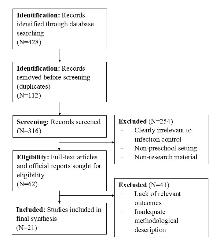 The selection process followed PRISMA principles, as detailed in Figure 1. The initial search identified 428 records. After removing duplicates, 316 unique records remained for title and abstract screening. Of these, 254 records were excluded as clearly irrelevant to infection control or early childhood settings. Sixty-two full-text articles and official reports were assessed for eligibility. Forty-one were excluded due to lack of relevant outcomes, inadequate methodological description, or non-preschool settings. A total of 21 studies met the inclusion criteria and were included in the final synthesis (Figure 1).
