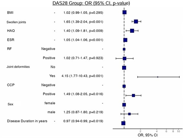 The logistic regression analysis was conducted to identify predictors of disease activity in rheumatoid arthritis (RA) patients, categorized by Disease Activity Score in 28 joints (DAS28) as either low disease activity (DAS28 <3.2) or moderate-to-high disease activity (DAS28 ≥3.2). Key findings indicate that swollen joint counts (OR=1.65, 95% CI [1.39, 2.04], p<.001), Health Assessment Questionnaire (HAQ) scores (OR=1.40, 95% CI [1.09, 1.81], p=.009), erythrocyte sedimentation rate (ESR) levels (OR=1.05, 95% CI [1.04, 1.06], p<.001), and positive anti-CCP antibody titers (OR=1.49, 95% CI [1.08, 2.05], p=.016) were significant predictors of higher disease activity in multivariable analysis. Patients with joint deformities had markedly increased odds of higher disease activity (OR=4.15, 95% CI [1.77, 10.43], p=.001). Conversely, body mass index (BMI), rheumatoid factor (RF) positivity, gender, and disease duration showed no significant associations with higher DAS28 scores in multivariable analysis. These results underscore the importance of swollen joint counts, functional disability, inflammatory markers, and autoantibody status in predicting disease severity in RA, highlighting the need for comprehensive assessment and targeted interventions for patients with elevated DAS28 scores.