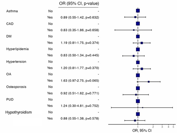 Figure 2. Multivariate analysis of the association between the probability of anemia and various comorbidities in the KRRD. CAD: Coronary Arterial Disease; DM: Diabetes Mellitus type 2; OA: Osteoarthritis; PUD: Peptic Ulcer Disease.