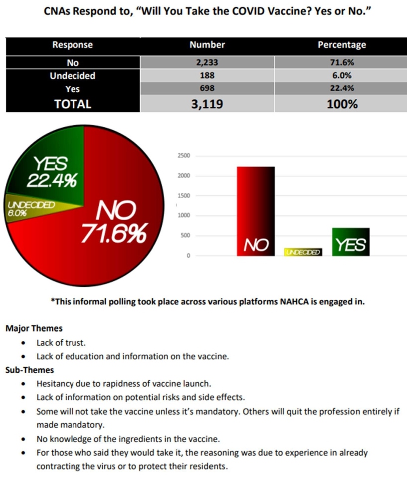 To ascertain the degree of and reasons for COVID-19 vaccine hesitancy in this population of nursing home caregivers, the National Association of Health Care Assistants (NAHCA) conducted an informal poll in November 2020 of thousands of CNAs about whether or not they would take the COVID vaccine once it became available, and their reasons for planning to accept or decline the vaccine.