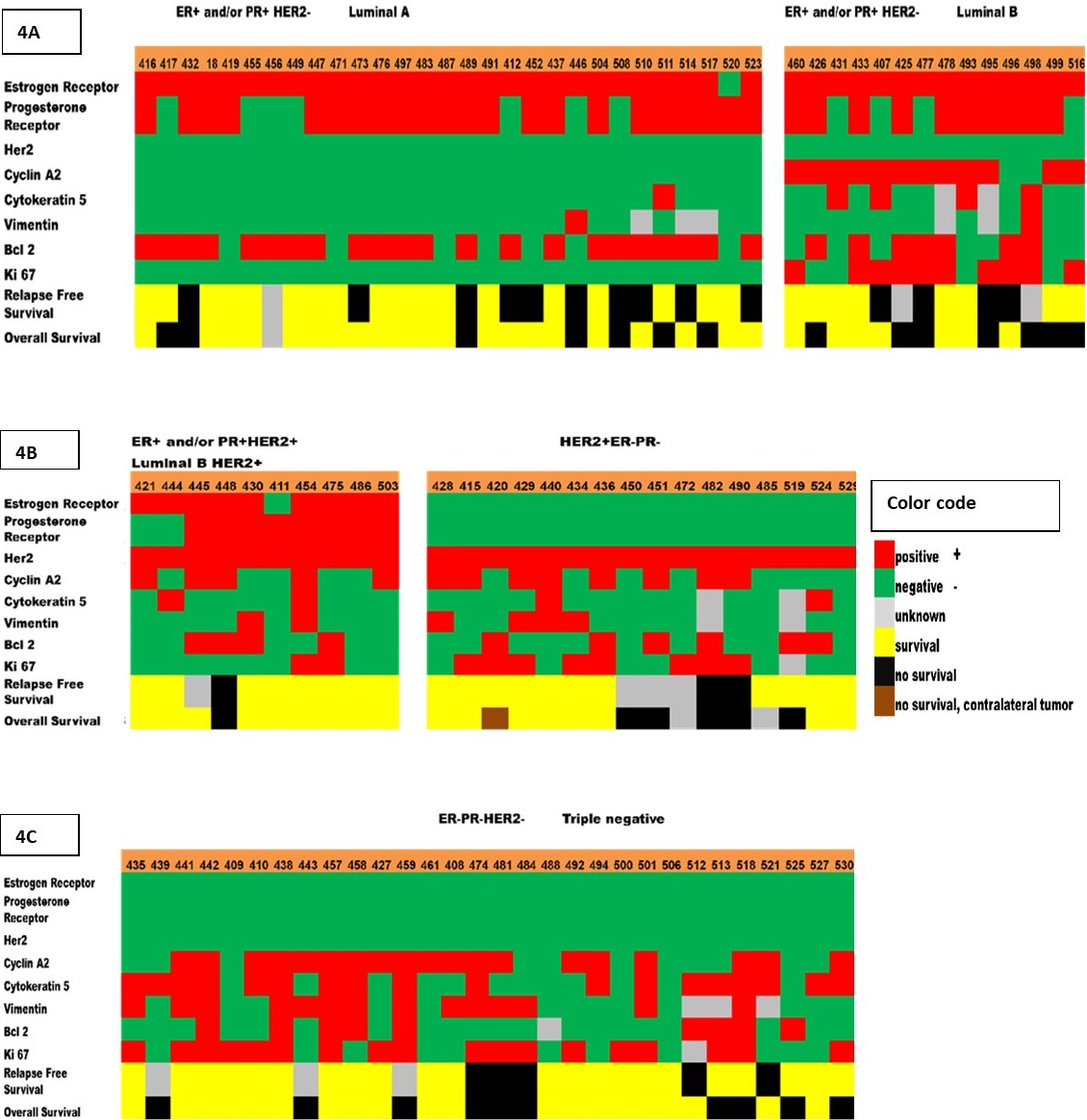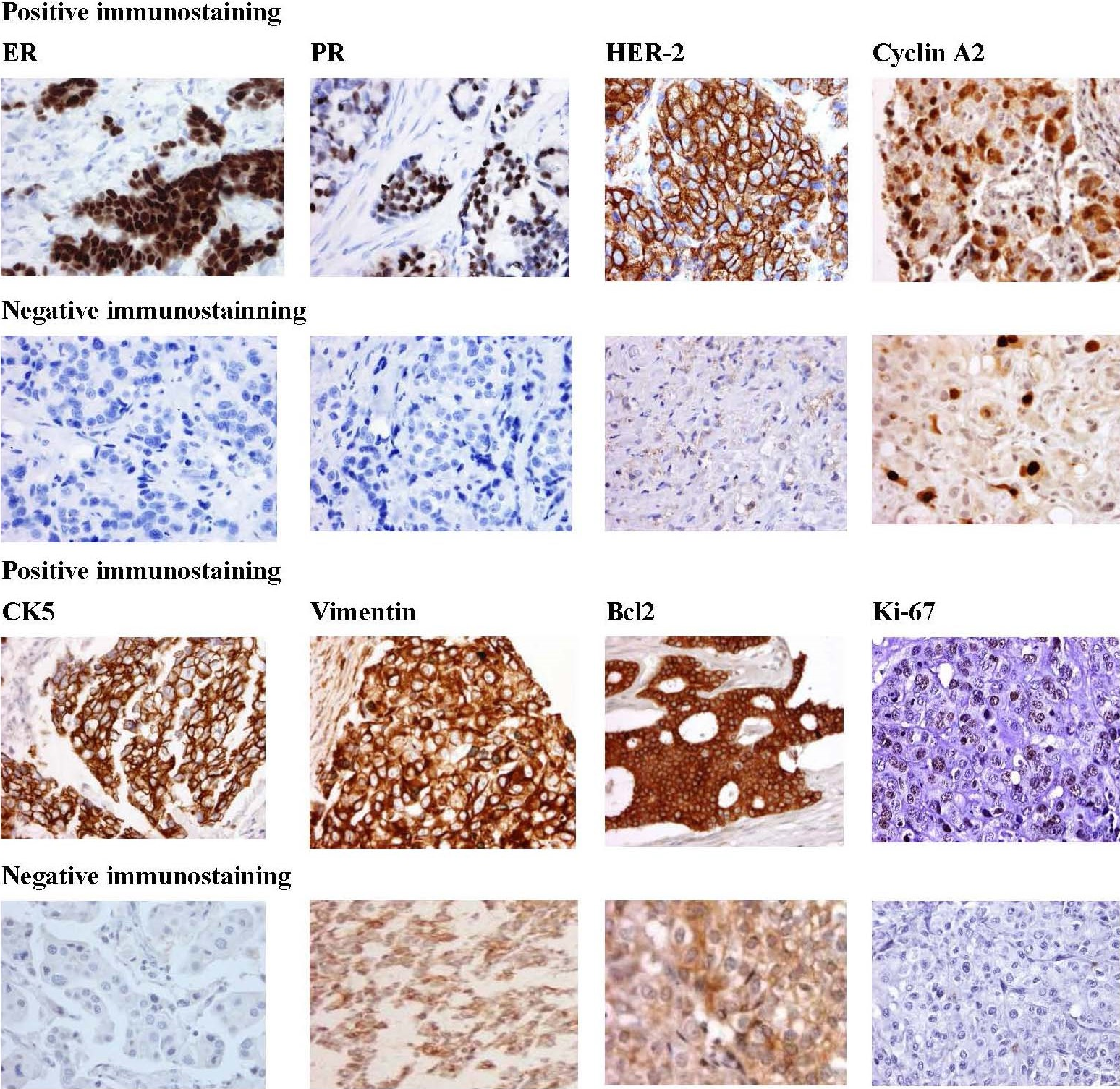 TMA have been constructed, prepared and stained for proteins markers (Figure 1) (ER, PR, HER-2, Cyclin A2, CK5, Vimentin, Bcl2, and Ki-67) that would distinguish 5 tumor subtypes: luminal A (ER+and/or PR+, HER-2-); luminal B (ER+and/or PR+ , HER-2-, Cyclin A2+ and/or Ki-67+); luminal B HER-2+ (ER+, and/or PR+, HER-2+); HER-2+ (ER-, PR-, HER-2+), and triple-negative (ER-, PR-, HER-2-). These subtypes are known to be associated with different relapse-free survival and overall survival.