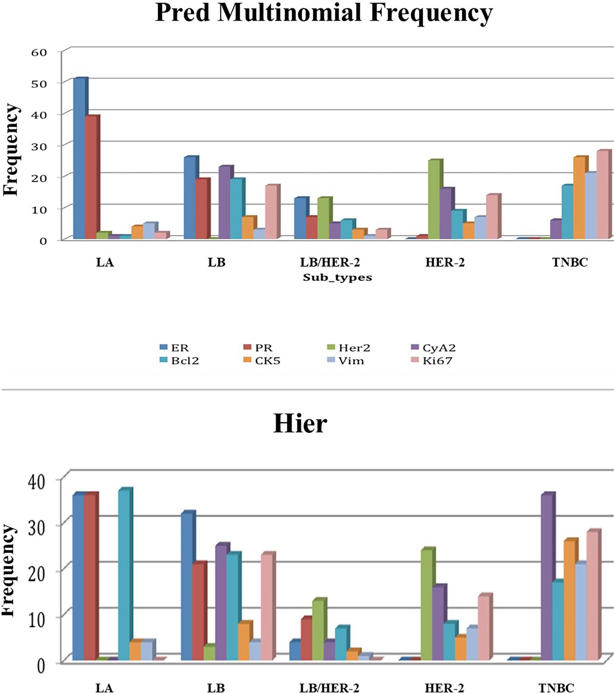 For the supervised method, multinomial logistic regression analysis [45,46] was conducted using an empirically classified training data set. The empirical classification was based on previously published cDNA microarrays, reverse transcription-quantitative polymerase chain reaction (RT-qPCR), TMA, and protein studies [20,32,34,47,48]. The predictive clusters for the supervised and unsupervised methods were compared for agreement with the empirical classification. Kappa values [49] were used to determine the overall percent correct clusters and agreement between specific clusters. For high values of Kappa, the lower limit of the confidence interval was used for verification. Chi-square statistics [50] was used to examine the association between hierarchical and multinomial logistic clustering methods.