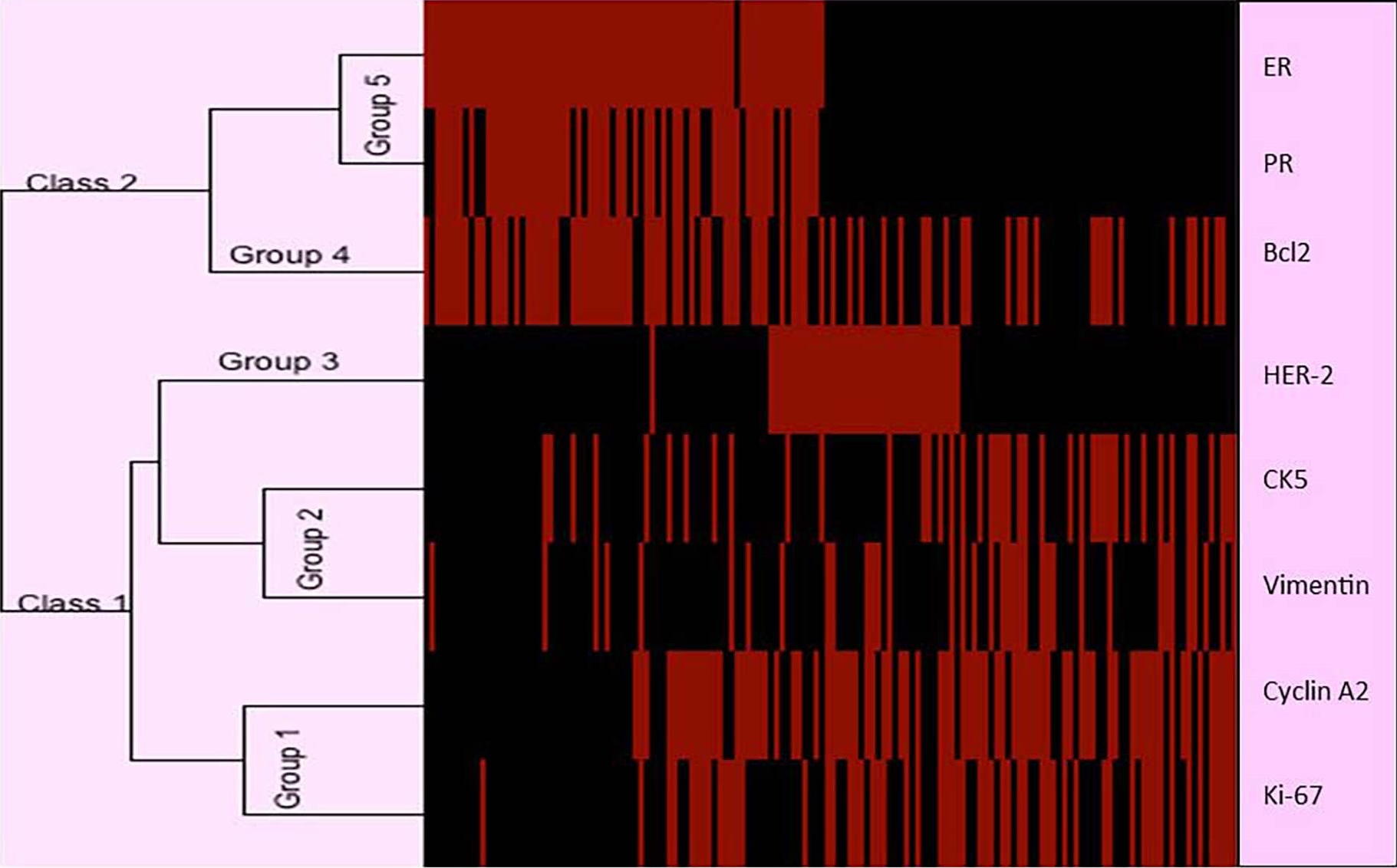 Methods: Eight protein biomarkers (ER, PR, HER2, Cyclin A2, Cytokeratin 5, Vimentin, Bcl2, and Ki-67) were evaluated using tissue microarrays (TMAs) and immunohistochemistry (IHC). The IHC results from TMAs were analyzed by both supervised and unsupervised clustering methods. The predictive clusters for the supervised and unsupervised methods were compared for agreement with the empirical classification. Kappa values were used to determine the overall percent correct clusters and agreement between specific clusters. Chi-square statistics was used to examine the association between hierarchical and multinomial logistic clustering methods. Results: Five subtypes of breast tumors with distinct protein expression patterns were identified among the studied 166 breast tumors. Luminal B tumors have been distinguished from luminal A tumors by staining for cell cycle proteins Cyclin A2 and Ki-67, which promote cell proliferation. Forty-nine percent were stained positive for Cyclin A2, 39.2% positive for Ki-67, and 37% positive for both Cyclin A2 and Ki-67. The age of patients did not show any significant effect whether five (p-value= 0.576) or eight (p-value= 0.605) biomarkers were used, which indicating that age did not have any influence on the classification of the subtypes. Ninety percent of the thirty triple negative tumors were positive for Cyclin A2 or Ki-67 or both. Six-year overall survival was better for luminal A tumors (76%) than luminal B tumors (71%). Likewise, six-year relapse-free survival was better for luminal A tumors (76%) than luminal B tumors (29%).