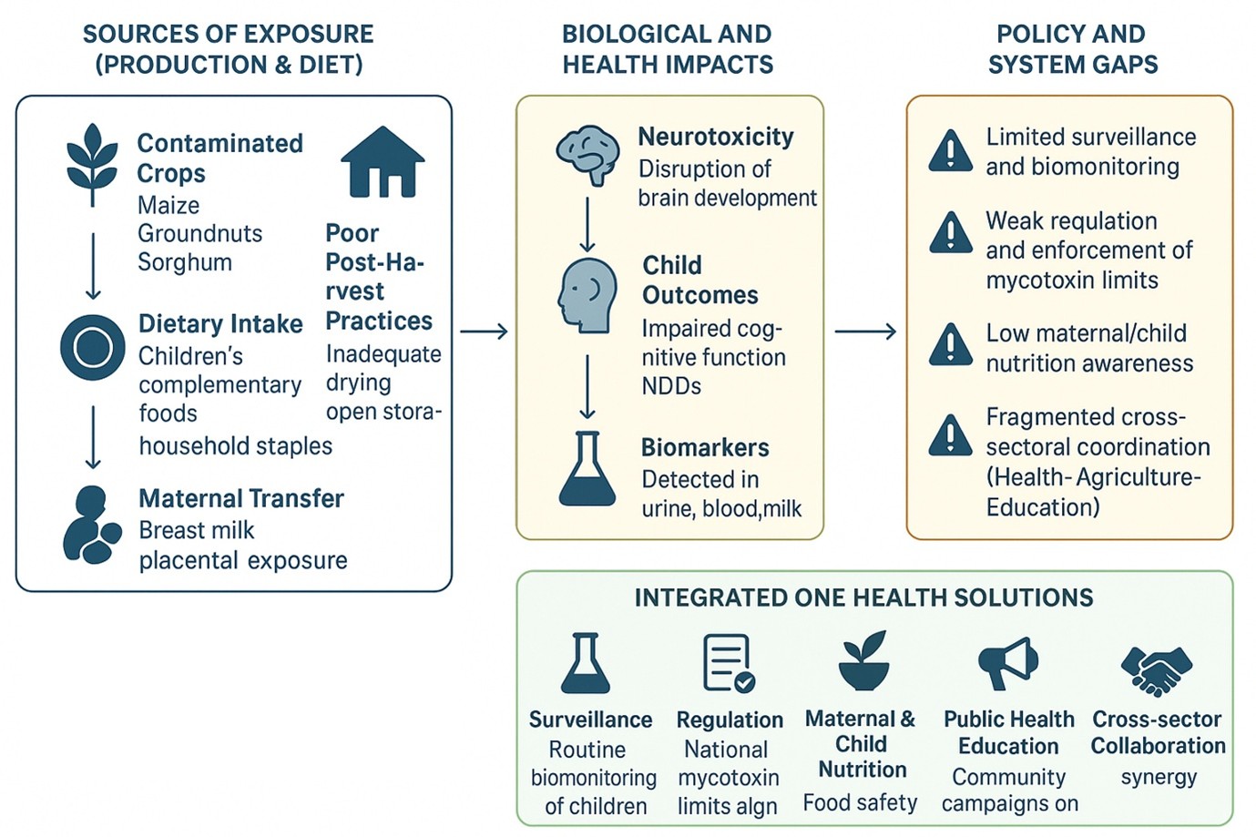 Figure 3. Conceptual framework illustrating the pathways of mycotoxin exposure in Cameroon, the resulting neurodevelopmental risks in children, and the critical gaps in surveillance, regulation, maternal nutrition, and public health education.