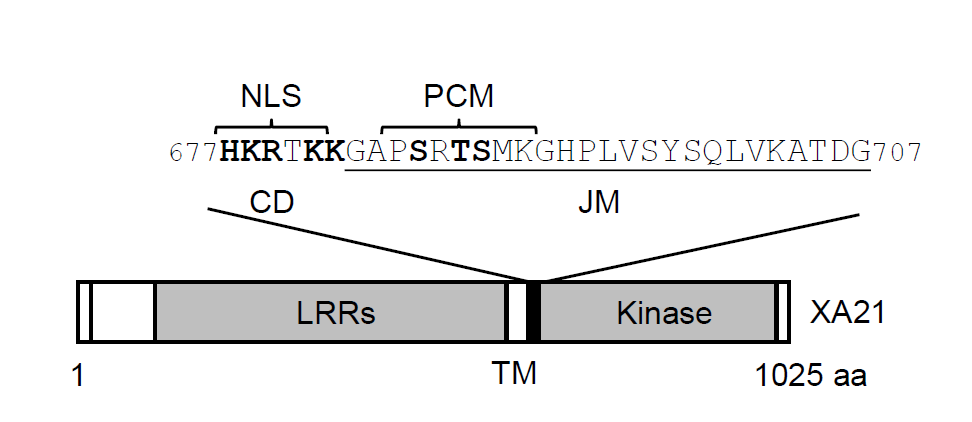 Figure 1. Schematic representation of XA21. The domains of XA21 were described previously [3]. The positively charged residues in the NLS and the autophosphorylated residues in the JM domain are shown in bold. LRRs: Leucine-Rich Repeats; TM: Transmembrane domain; CD: Charged Domain; JM: Juxtamembrane domain; NLS: Nuclear Localization Signal; PCM: Putative proteolytic Cleavage Motif.