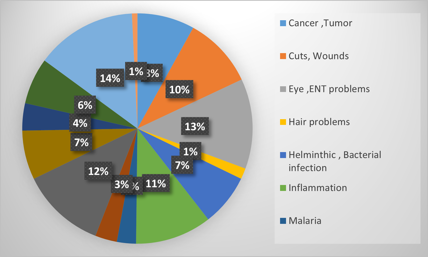 Figure 2. Percentage of vegetable plant species used for various ailments.