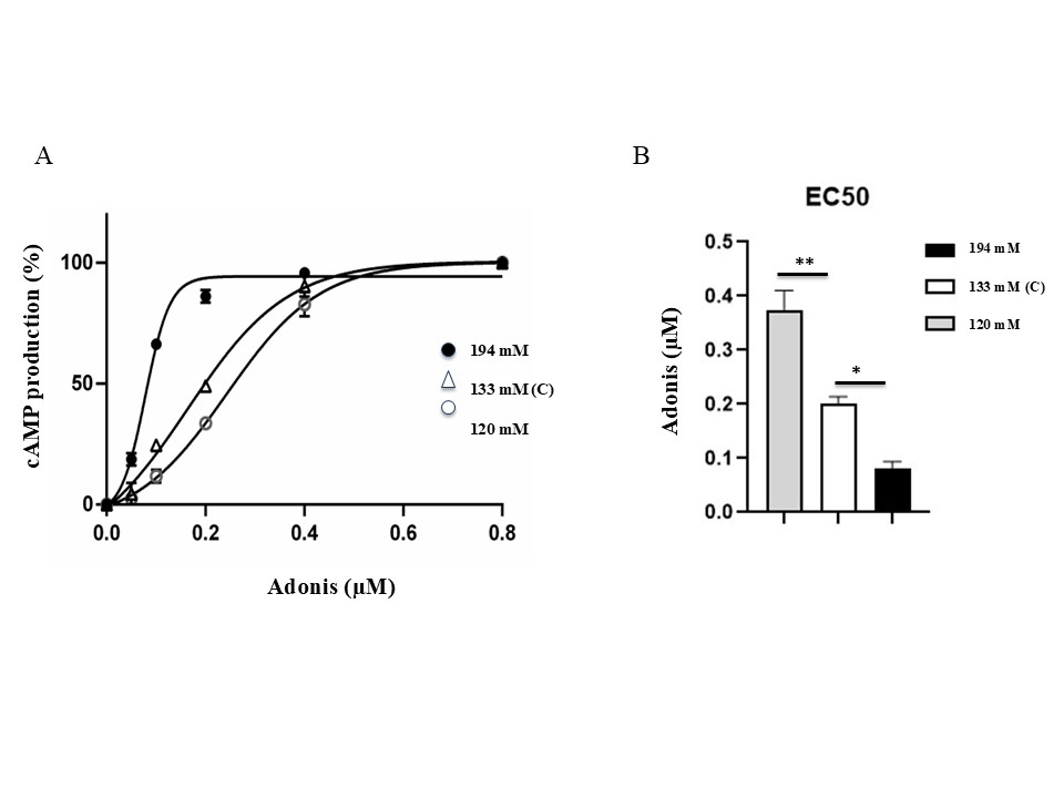 Figure 4. Effects of salt concentration on Adonis cAMP production and EC50. PBMCs were exposed to three concentrations (120 mM, 133 mM and 194 mM) for 24h and then incubated with Adonis. cAMP production was measured and quantified as described in Material and methods. (A) Data are presented as mean of duplicated experiments and expressed as a percentage of the total cAMP production (see also Table 1). (B) EC50 values are presented as mean ± SD. One-way ANOVA analysis with Tukey's post-hoc test. A p value <0.05*, <0.001** or <0.0001*** was considered as statistically significant.