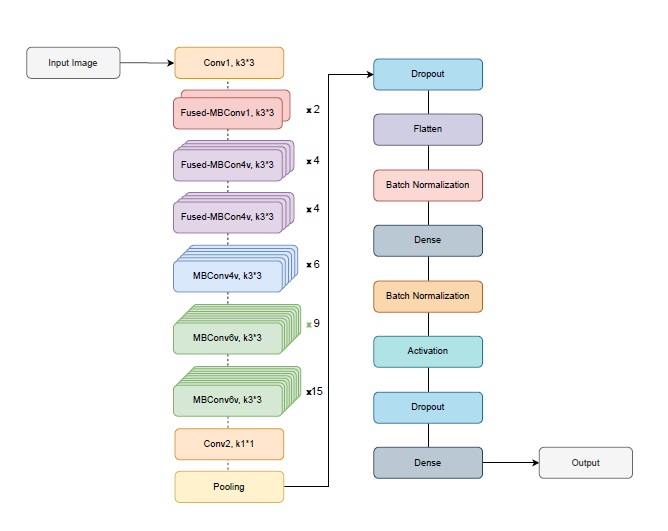 EfficientNetV2S: EfficientNetV2 is a more recent evolution of the EfficientNet architecture, designed to address efficiency limitations. The EfficientNetV2S model achieves both speed and accuracy by blending fused-MBConv layers in the early stages and MBConv layers in deeper stages. Progressive learning, a strategy where input image resolution is gradually increased, further improves robustness to varying scales, leading to better generalization.