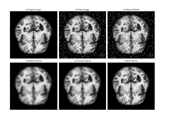 Figure 3. Visual comparison of denoising methods: (a) Original MRI image, (b) Noisy image, (c) Bilateral Filter, (d) Median Filter, (e) Gaussian Filter, (f) NLM Filter.