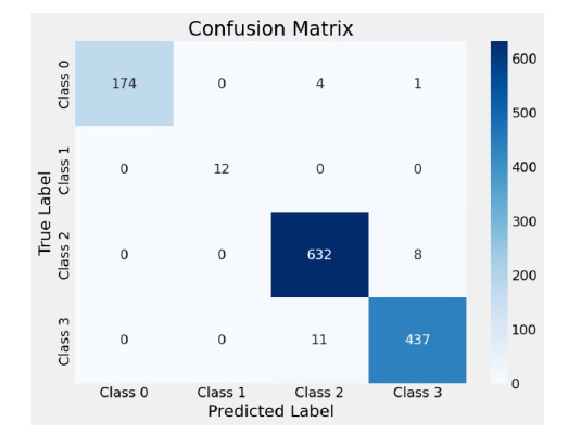 This section examines the performance of the EfficientNetV2S model in detail, focusing on its training and validation progression and classification accuracy across different classes. The EfficientNet model’s training dynamics are depicted in Figure 4. Notably, the validation curves experience an initial spike in the early epochs, suggesting rapid initial learning, after which they gradually converge. This behavior indicates that the model quickly learns generalizable features in the early stages. As the training progresses, the loss curves (both training and validation) show a steady decline, with the validation loss stabilizing towards the later epochs. This suggests effective learning without significant overfitting. Moreover, the model’s convergence speed is relatively fast, as evidenced by the rapid decline in loss early on, followed by a slower, more stable reduction in later epochs. There are no significant signs of underfitting or over-fitting, as the training and validation performance align closely over time, indicating that the model is able to generalize well to unseen data. The absence of significant gaps between the training and validation metrics further supports the model’s robustness and its ability to avoid overfitting during training. The confusion matrix in Figure 5 further highlights the model’s classification effectiveness across all classes. Based on the confusion matrix, we observe that the model performs very well on most classes, with a few exceptions. Class 0 (healthy) is correctly identified with high accuracy, showing 174 true positives, but there are small misclassifications with 4 instances in- correctly predicted as class 2 and 1 instance as class 3. For Class 1 (mild cognitive impairment), the model struggles more, with 12 true positives and no instances misclassified into other classes, indicating that the model might find it more challenging to distinguish mild cognitive impairment from other stages. Class 2 (Alzheimer’s) is identified with a high degree of accuracy, with only 8 instances misclassified as class 3, which is a relatively low number compared to the total of 632 true positives. Similarly, Class 3 (severe Alzheimer’s) is also well recognized, with 437 true positives and 11 instances incorrectly classified as class 2. The difficulties observed with class 1 and the small misclassifications between classes 2 and 3 could stem from the overlap in symptoms or features between the different stages of Alzheimer’s, which might make these stages harder for the model to differentiate clearly.