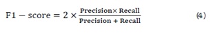 F1-score: The harmonic mean of precision and recall, providing a balance between the two metrics. It is particularly useful in situations where there is an imbalance between the positive and negative classes. The F1-score is a critical measure in medical diagnosis, as it accounts for both false positives and false negatives, ensuring that both precision and recall are optimized. It is calculated as: