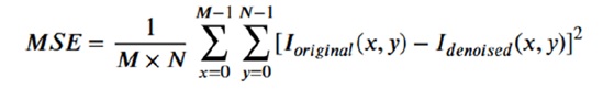 where M and N represent the dimensions of the image. A lower MSE value indicates better denoising performance, as it means the denoised image is closer to the original.