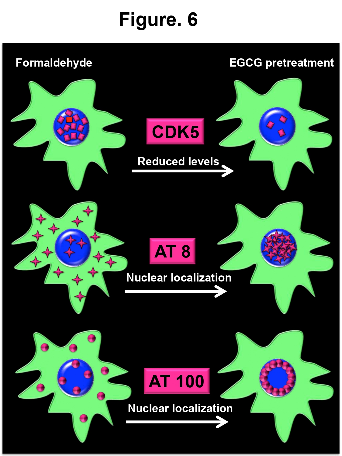 Figure 6: EGCG pretreatment modulates Tau phosphorylation. The cartoon depicts the effect of EGCG pretreatment on the levels of Tau kinase, CDK5 and localization of phosphorylated nuclear Tau. EGCG pretreatment reduces the levels of CDK, which are increased in formaldehyde treatment. Further, it modulates localization of Tau phosphorylated at two epitopes towards nucleus. This nuclear localization may have various implications in AD.